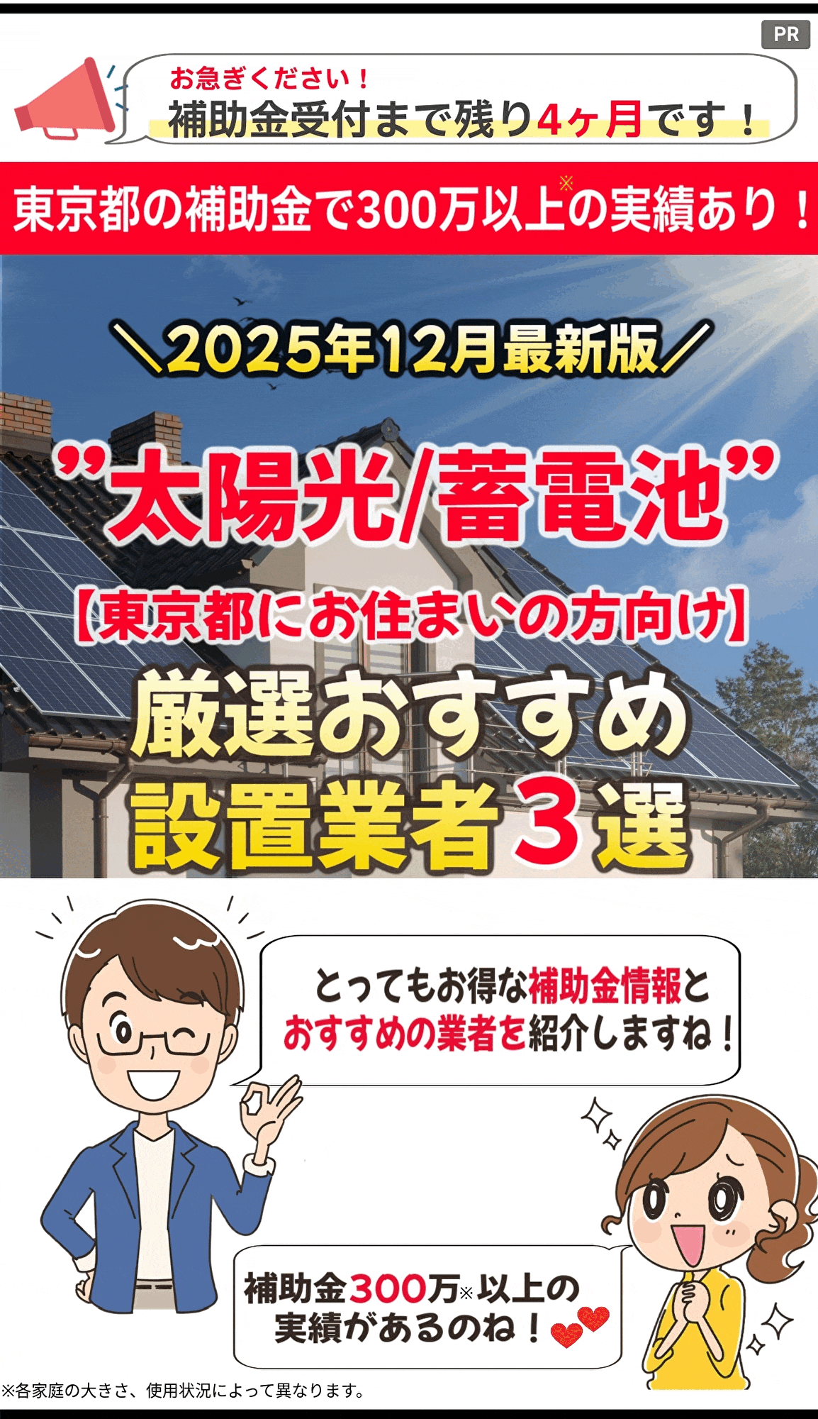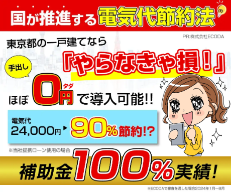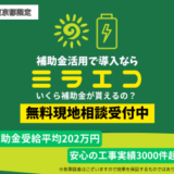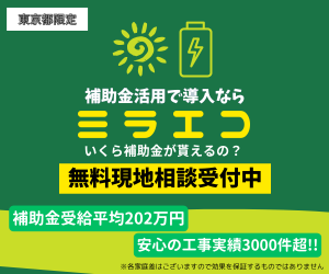 補助金最大617万円の実績あり※1 ECODA ※1当社実績より抜粋 信頼できる設置業者の選び方 蓄電池や太陽光は長期にわたって使う大きな買い物。 だからこそ、「どの業者に任せるか」で満足度や費用対効果は大きく変わります。 ここでは、補助金を確実に活用し、安心して導入できるための業者選びのポイントをご紹介します。 ①補助金対応力 ✅補助金対応力 東京都の蓄電池補助金は「契約前の事前申込」が必須条件です。 ✅太陽光+蓄電池のトータル提案力 蓄電池単体よりも、太陽光発電とセットで導入する方が電気代削減効果は大きくなります。 ✅アフターサポート体制 蓄電池は10年以上使い続ける設備です。 ✅実績と口コミ評価 実際に東京都の補助金を利用した導入事例を多く持っているかどうかは大きな判断基準です。 「施工実績の件数」 「お客様の声や口コミ」 「地域での信頼度」 これらをチェックし、実績豊富で評判の良い業者を選ぶと安心です。 👉 「補助金申請のサポートが万全」「太陽光とのセット提案に強い」「長期アフターサポートがある」「導入実績が豊富」 補助金最大617万円の実績あり※1 ECODA ※1当社実績より抜粋 安心して依頼できる! ここまでご紹介したように、補助金の活用や長期的な安心のためには、業者選びがとても重要です。 そこで今回、数ある施工業者の中から、東京都にお住まいの方に本当におすすめできる専門業者を3社だけ厳選しました。 それぞれの業者の特徴と選ばれている理由を詳しくご紹介します。 \当サイト一押し/ 太陽光・蓄電池導入なら、実績豊富な株式会社ECODAがおすすめです! Googleレビュー平均★4.6の高評価を誇り、年間1,800件以上の施工実績で圧倒的な信頼を集めています。 導入前は無料シミュレーション・現地調査で徹底診断、さらに補助金申請成功実績100%※3 最長25年の安心保証付き※2で、しつこい営業は一切なし!初期費用ゼロプラン※4も用意されているため、「補助金をフル活用して電気代を大幅に削減したい」「他社の見積で迷っている」という方にぴったりです。 今、東京都の補助金制度を最大限活かせるチャンス。 信頼と実績のプロ集団ECODAを選ぶのが、賢いご家庭の新常識です! 今回 太陽光発電設備を友人の所で設置するということで業者さんがどのような方なのか同席して話を聞いて欲しいとのことで城野さんの説明を伺いとても信頼できる説明を受けて、それならうちもお願いしますと今日の設置工事になりました。5人のスペシャリストが見えてほぼ休まずに5時間ちょっとで完了しました。素晴らしい出来栄え👍感動です やってよかった。 5月終わりに相談してからおよそ2ヶ月でパネル、蓄電池、エコキュートの設置が完了しました。 2月に相談をはじめ、無事に4月に工事までたどり着くことができました。ご担当の城野さん、丁寧なご対応、大変ありがとうございました。LINEでChatできたので、素早くかつ心配なく進めることができました。 ※Google口コミより引用 ECODAは、以下のニーズを持つ東京都のご家庭に特におすすめです。 💰補助金の活用を確実にお任せしたい方 ⚡ 自家発電・蓄電で電気代を抑えたい方 🛡 長期保証と手厚いアフターサービスを重視する人 🏠複数メーカーの製品を比較したい方 🔧長期的な信頼できるフォロー体制を求める方 補助金最大617万円の実績あり※1 ECODA [PR]Sponsored 株式会社ECODA ※1当社実績より抜粋 ※1 2025年9月5日時点の口コミ数と評価 太陽光・蓄電池の導入を本気で考えるなら、ミラエコは最有力候補です。 東京都渋谷区に本社を構え、全国展開する住まいの総合企業で、太陽光・蓄電池の設置はもちろん、リフォームや不動産売買まで幅広く対応。 導入前には無料シミュレーションで最適なプランを提案し、補助金申請やローン相談も徹底サポート。 特に注目すべきは「ローンのプロフェッショナル」としての強みです。 他の事業者が提携ローンのみの対応なのに対し、ミラエコなら銀行ローンでの導入も可能。 これにより資金計画の自由度が大きく広がります。 さらに最長25年の製品保証※2、10年の自然災害補償、5年ごとの定期点検で、設置後も安心が長く続くのも大きな魅力。 「電気代を下げたい」「補助金をしっかり活用したい」「銀行ローンで賢く導入したい」という方に最適な、信頼と実績のプロ集団です。 ※Google口コミから一部引用 事前説明から見積までの行程で導入意欲はどんどん増し、結果、導入することにしました。無事に工事も終わり、私も家族も非常に満足しております。 ※Google口コミから一部引用 事前に近所の方へも挨拶してくれるなど丁寧に対応してくださいました。また工事後の説明も丁寧だったと夫が言っておりました。電気代もどんどん高くなるので、補助金を使って設置できて本当に良かったです! ※Google口コミから一部引用 わかりやすい説明でした。うちの事情を説明したら、いろいろと調べてくれました。質問にも誠実に回答してもらいました。 💰 補